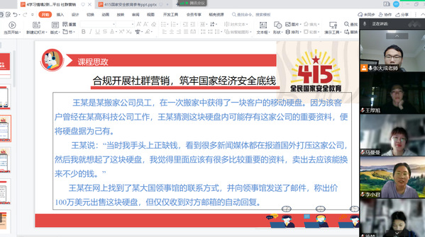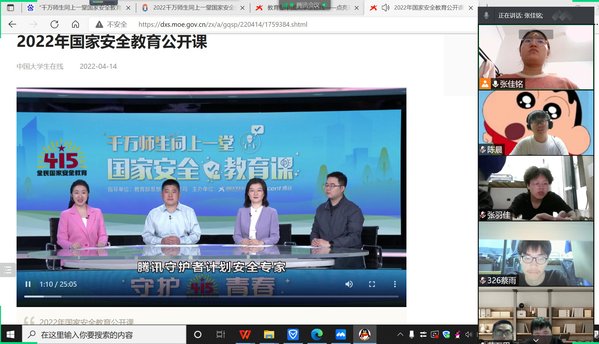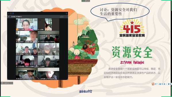 4月15日,組織召開線上“國家安全教育”主題班會,深入推進國家安全法、反恐怖主義法、網絡安全法等國家安全法律的學習宣傳教育,結合新冠肺炎疫情防控形勢任務,突出公共衛生安全、生物安全等宣傳教育内容。班主任、輔導員組織學生通過觀看宣傳視頻、學習相關資料,積極參與讨論等喜聞樂見、通俗易懂的方式,帶領學生學習國家安全相關知識,讨論國家安全的重要意義,知曉在百年大變局和疫情疊加的時代背景下,公民在國家安全中的義務、權利以及掌握應對安全風險的能力,引導學生積極主動參與維護國家安全,做到人人有責、人人盡責,使大學生樹立國家安全底線思維,強化責任擔當,提高安全意識和安全素質。