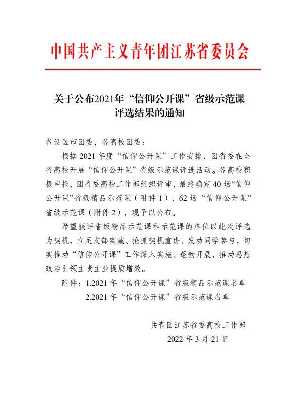 近日,由共青團江蘇省委舉辦的全省高校信仰公開課省級示範課評選結果公布,共評出40信仰公開課省級精品示範課和62信仰公開課省級示範課,我校報送課程獲評省級示範課。這是我校連續第三年獲此殊榮。